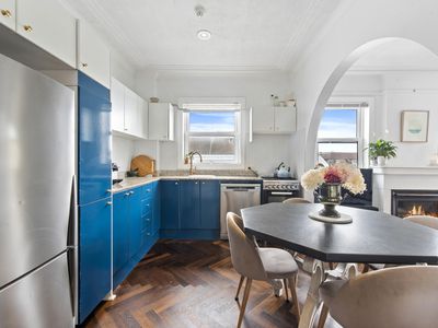 Footsteps to North Bondi village and just 200m to the sand and surf, this top floor Art Deco apartment is perfect for the beach lover. On the front wing of a boutique block of 12, the light and airy two-bedroom apartment offers fresh updated interiors and a relaxed ambiance in keeping with its coastal setting. Capturing ocean glimpses and refreshing sea breezes, this inviting beach pad comes with triple parking which is an absolute rarity in Bondi.