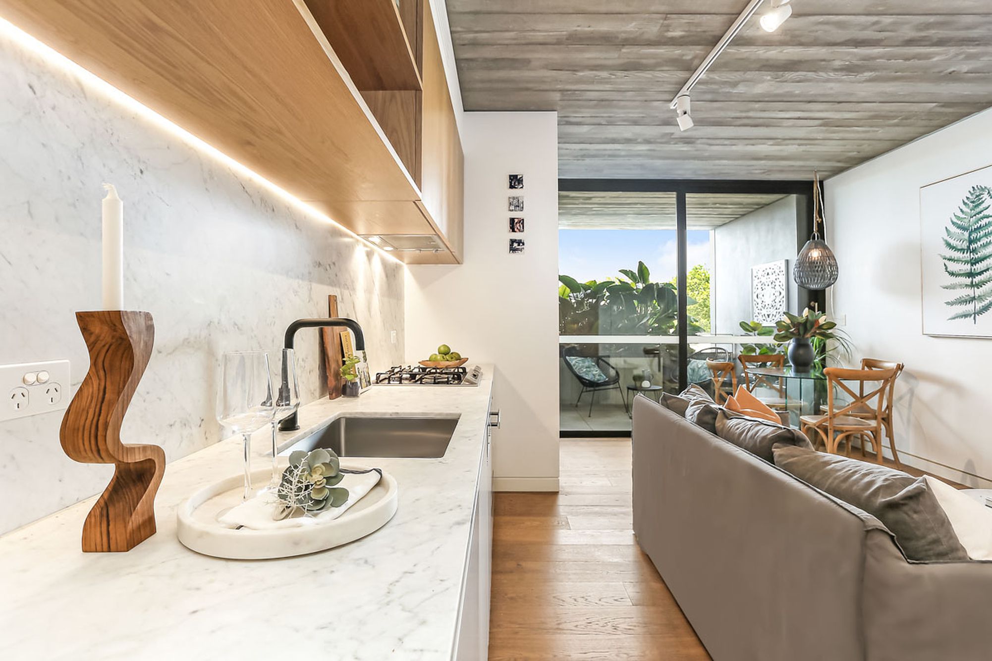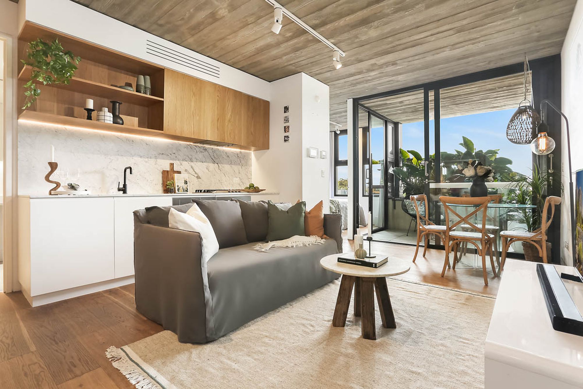 Nestled in a peaceful elevated position within the award-winning Short Lane development, this furnished one-bedroom apartment is showcasing bespoke interiors where exposed concrete ceilings are balanced by warm oak floors and full-height sliders leading to an outdoor sanctuary with leafy outlooks. This stylish furnished residence features the highest quality fittings in the acclaimed and sought after 'Short Lane'. Architecturally designed by award winning Domenic Alvaro at Woods Bagot.