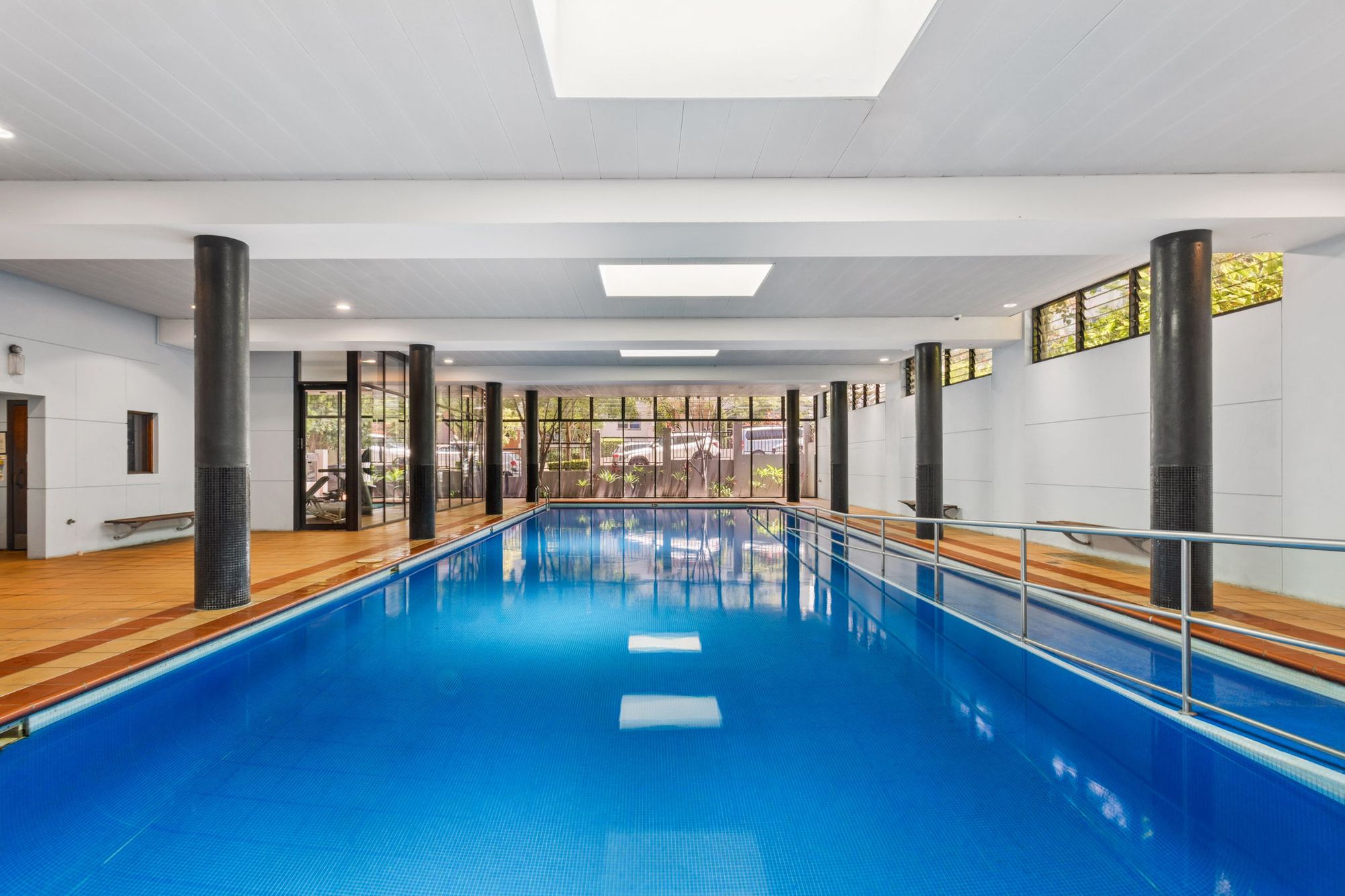 - Residents enjoy use of an outdoor pool, heated indoor lap pool, spa, saunas & well equipped gymnasium