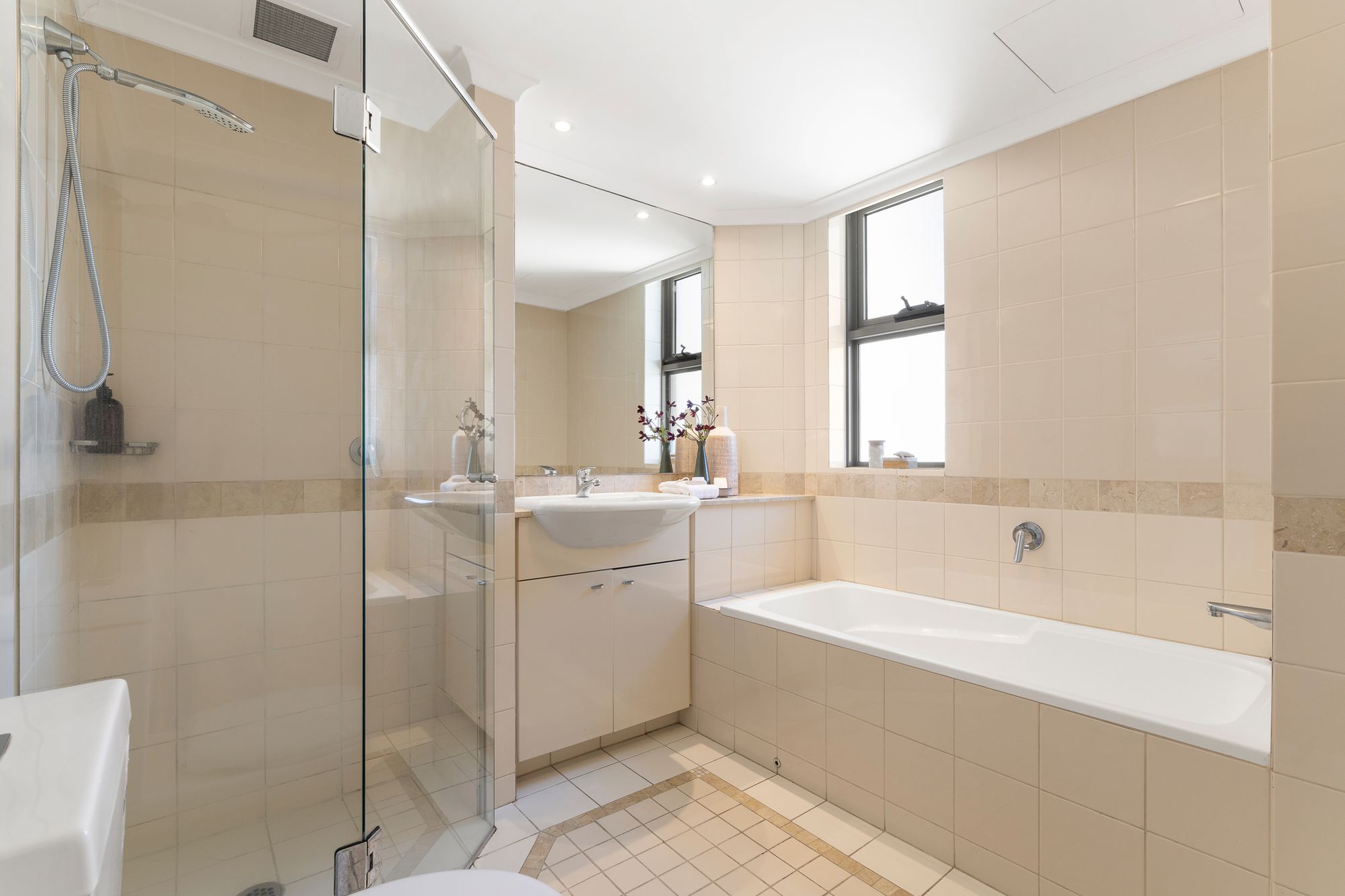 Master bedroom with private ensuite including separate bath and shower