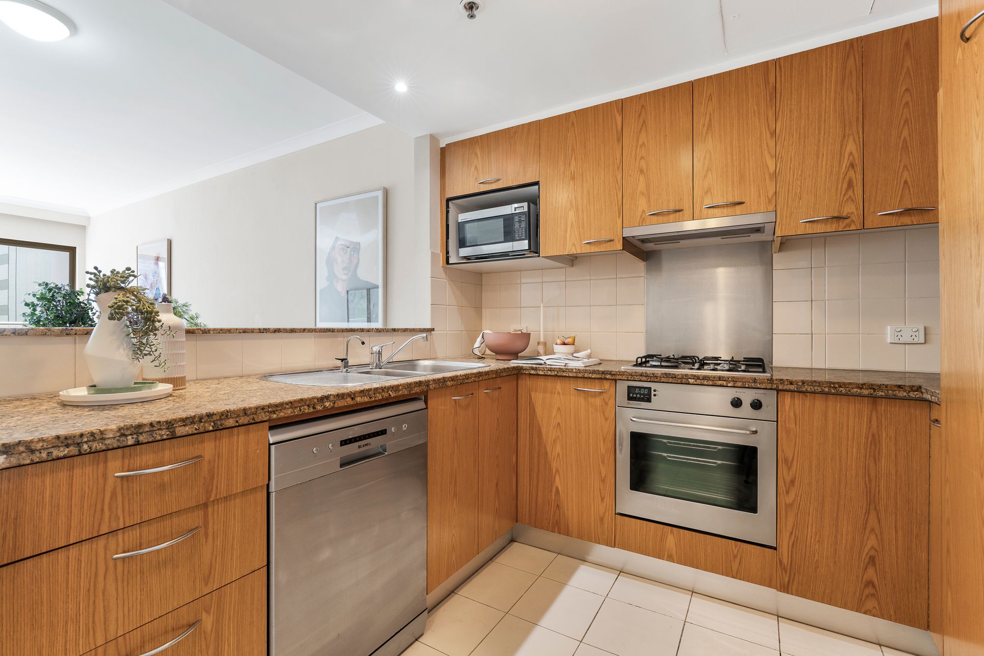 Contemporary stone kitchen with quality appliances and generous storage