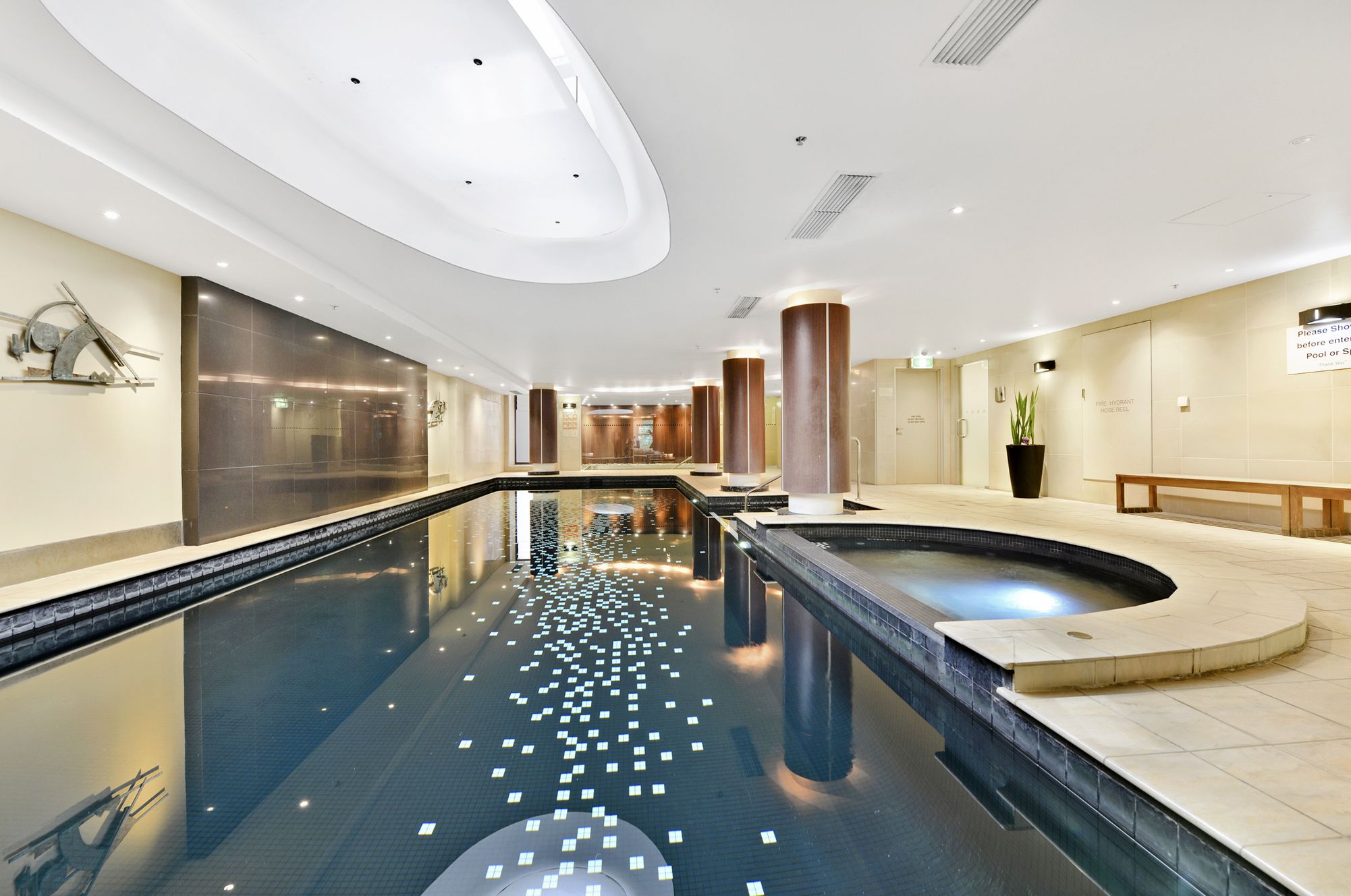Resort-style facilities including a heated indoor pool, spa, sauna and gym